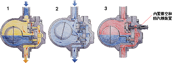 | 1. 在起機(jī)階段,熱靜力排空 裝置(TV)可排出空氣,否則空氣積聚在疏水閥內(nèi)會(huì)引起氣鎖。 | 2.當(dāng)冷凝水到達(dá)疏水閥,浮球升起,閥門打開,熱的冷凝水使排氣閥關(guān)閉。冷凝水以飽和溫度排出。 | 3.當(dāng)所有的冷凝水被排出后,蒸汽進(jìn)入疏水閥。此時(shí)浮球下降,閥門關(guān)閉。閥芯總是低于水位的,以防直接蒸汽泄漏。 |