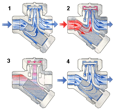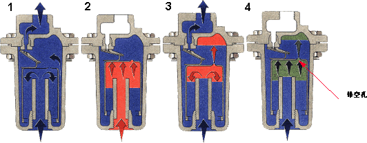 | 1.冷凝水到達(dá)疏水閥并在內(nèi)部形成水封。倒吊桶自身的重量使閥門打開,冷凝水便沿著倒吊桶排出。 | 2.蒸汽進(jìn)入吊桶內(nèi),產(chǎn)生浮力使吊桶升起,閥門關(guān)閉。 | 3.倒吊桶內(nèi)部的蒸汽不斷冷卻并從排氣孔中溢出,同時(shí)冷凝水進(jìn)入倒吊桶,閥門再次打開,整個(gè)工作循環(huán)不斷。 | 4.倒吊桶內(nèi)的排氣孔不斷將空氣排出至疏水閥頂部,由于排氣孔很小,排氣比較緩慢,因此常會(huì)需要安裝單獨(dú)的排氣閥。 |