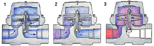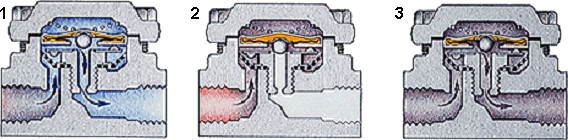| 1.起機(jī)階段閥門是打開的,冷凝水和空氣迅速排放。 | 2.熱的冷凝水通過疏水閥,雙金屬片組被加熱后膨脹,推動(dòng)閥芯靠近 閥座。當(dāng)冷凝水排放溫度接近蒸汽溫度時(shí),閥門關(guān)閉。 | 3.冷凝水冷卻,雙金屬片組 收縮,閥門再次打開,又排放冷凝水。工作不斷循環(huán)。 |