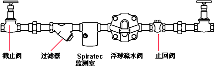●對(duì)于非直接排向大氣的系統(tǒng),在疏水閥的上游應(yīng)安裝Spiratec檢測(cè)裝置以便于監(jiān)測(cè)和及時(shí)發(fā)現(xiàn)疏水閥失靈或設(shè)備積水情況。有些情況下在疏水閥下游安裝觀視鏡來(lái)代替Spiratec檢測(cè)裝置。如安裝觀視鏡應(yīng)安裝于離噴排式疏水閥(如熱動(dòng)力疏水閥)下游至少一米處。